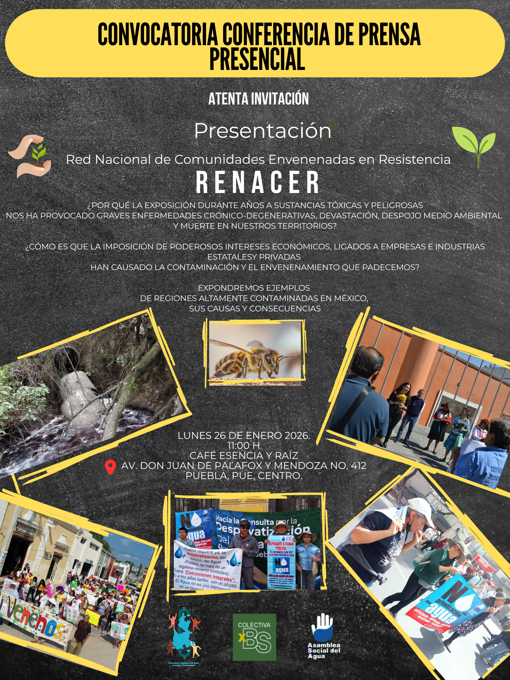 La Contraloría Autónoma del Agua en el Estado de Puebla, “Joel Arriaga” y la Asamblea Social del Agua, ASA en el marco del día mundial del Agua, presentes en el zócalo capitalino para celebrar y a la vez consternados por la ausencia de las autoridades locales a la exigencia de desprivatizar el servicio del Agua Potable y Alcantarillado que se entregó ilegalmente y que además, la empresa no ha dado cumplimiento. En consecuencia, el mas grave de los daños es en la salud de cientos de miles de poblanos que desconocen el motivo de diversas enfermedades catastróficas. Hay también daños al bolsillo de los usuarios y al erario público y un cínico estado de ilegalidad al practicar cortes de agua y drenaje.
